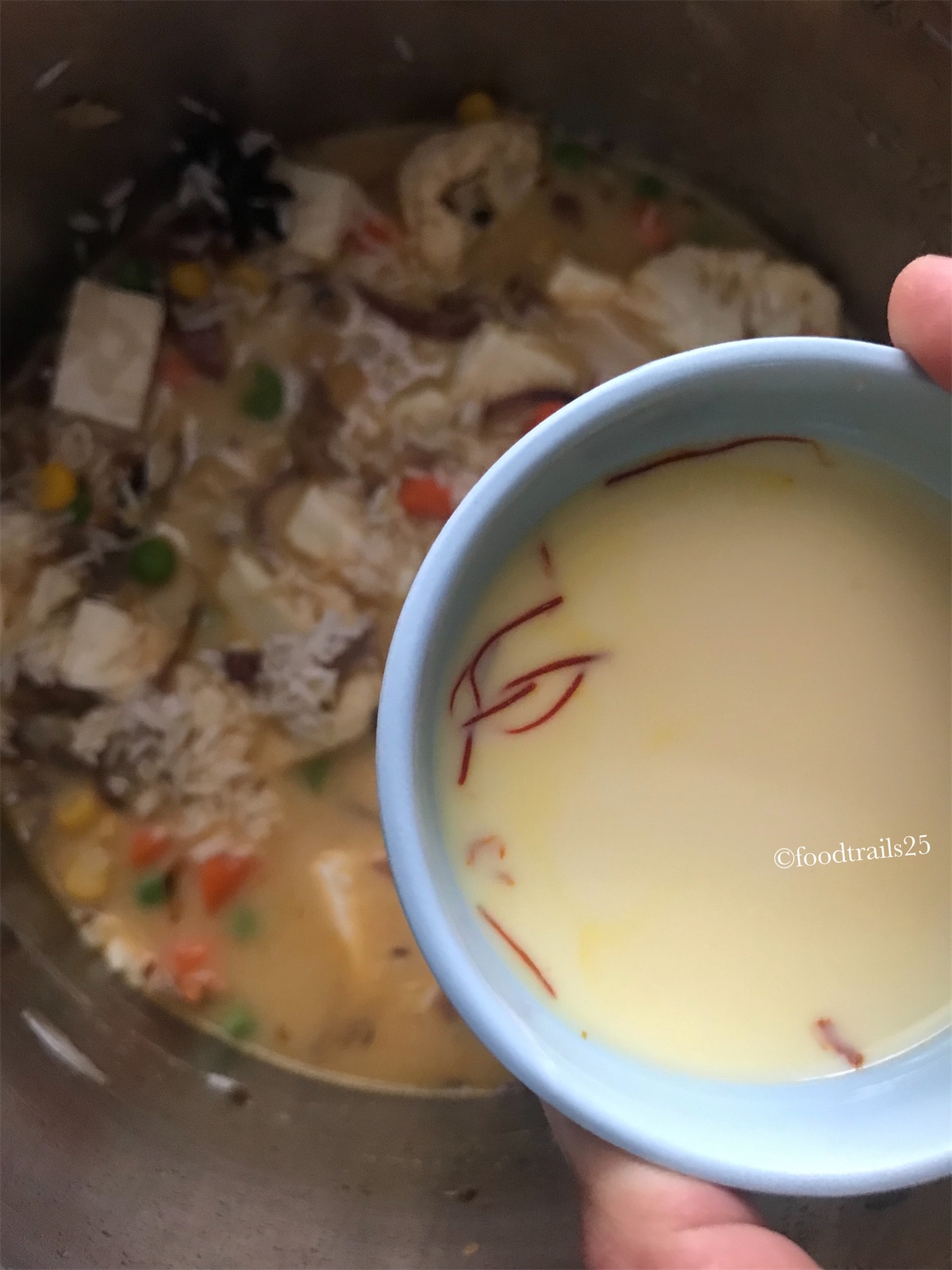 Add water around 1/2 cup and saffron infused milk and roughly torn mint and coriander leaves.