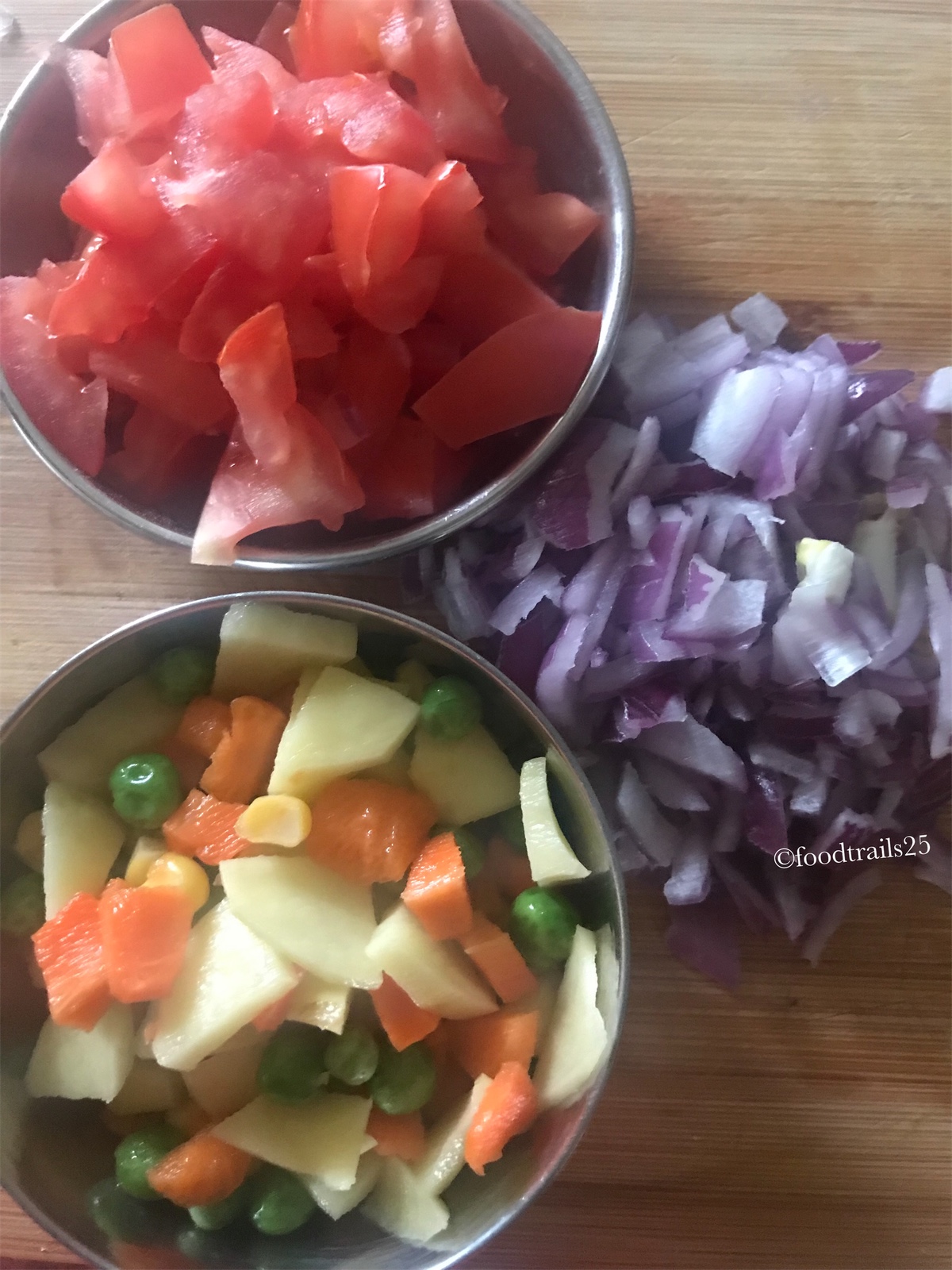- Finely chop onions and tomato. If adding potato, cut potato in small and thin pieces else these take time to cook or will be raw.