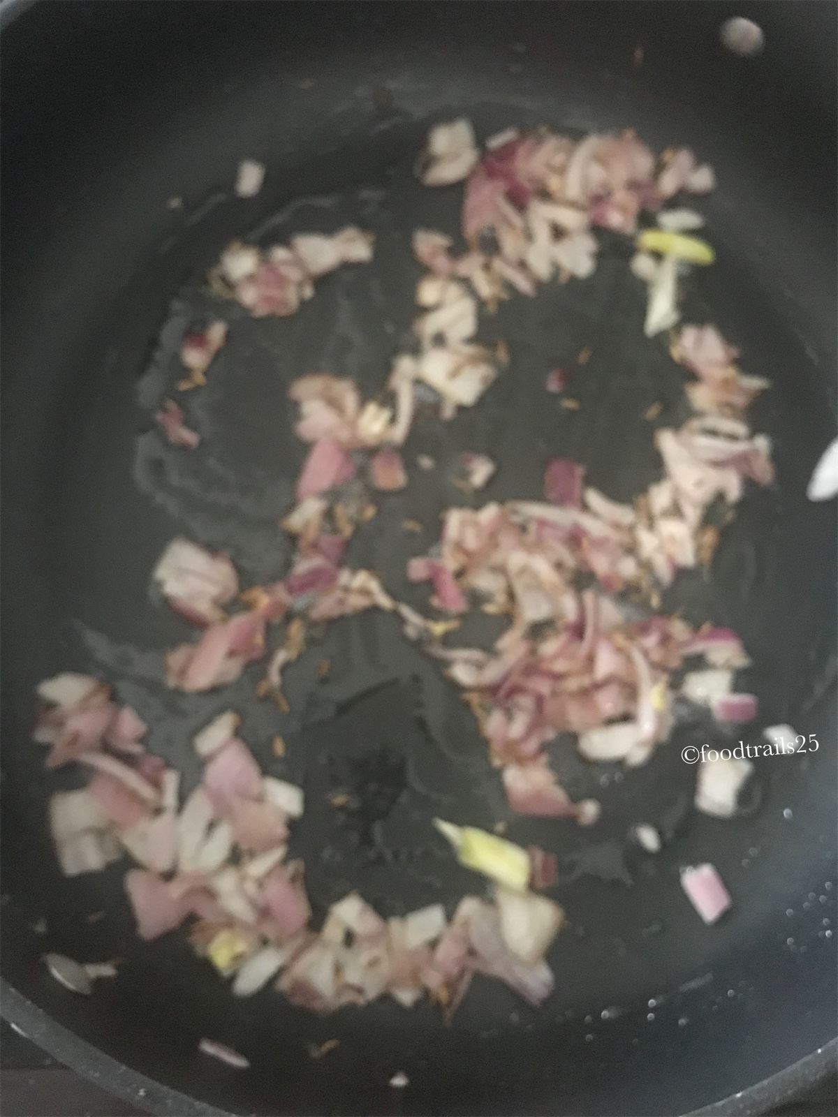- Once the seeds crackle, add finely chopped onions. When onions turn light pink, add chopped tomatoes.