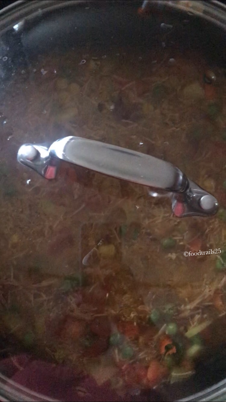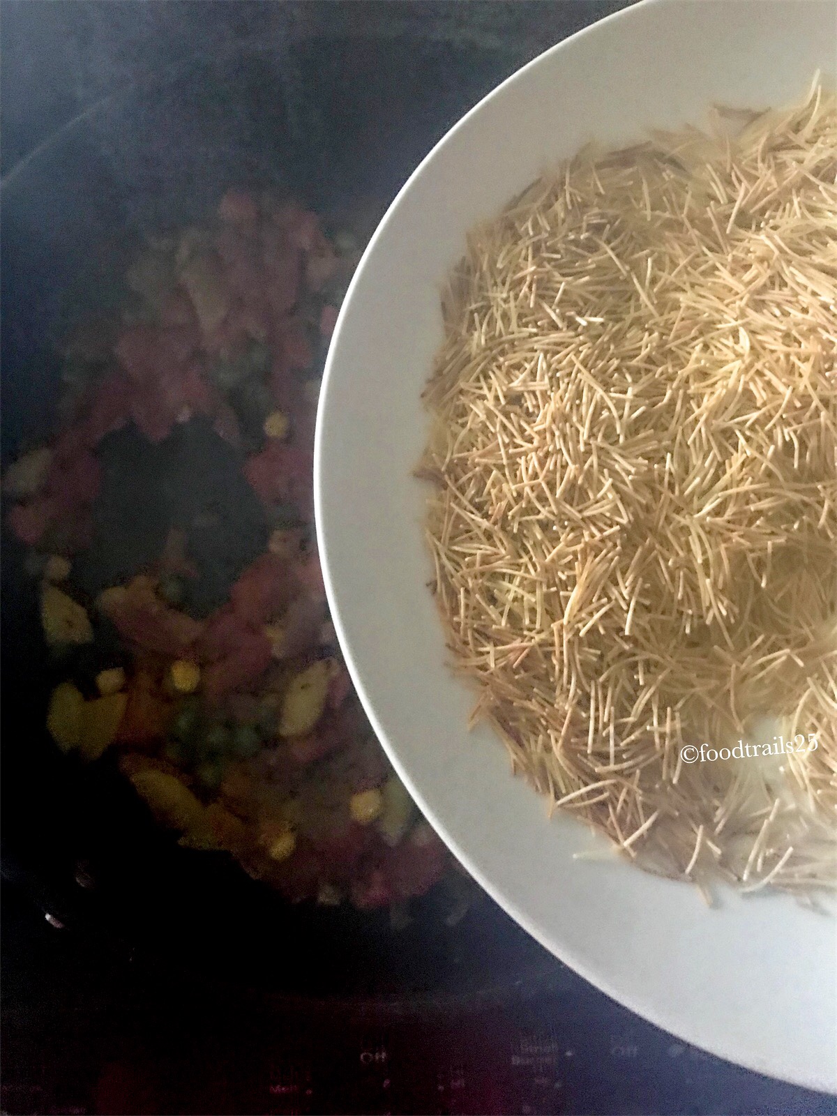 - Cover and cook on medium flame, till water dries up and vermicelli. Do not over mix vermicelli as these will get sticky and mushy. Also, once done, cover and keep off flame for 3-4 minutes.