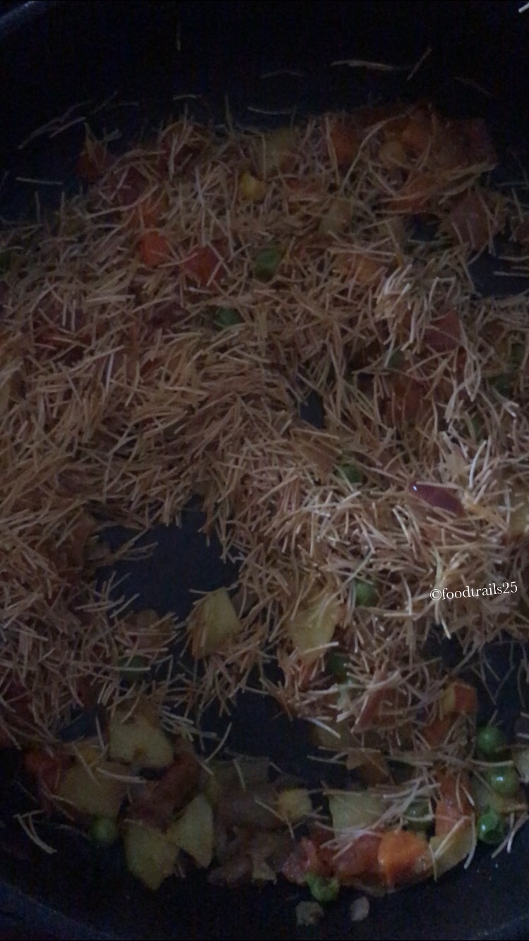 - Once the veggies are soft, add the roasted vermicelli mix well and add another 1/2 Cup water.