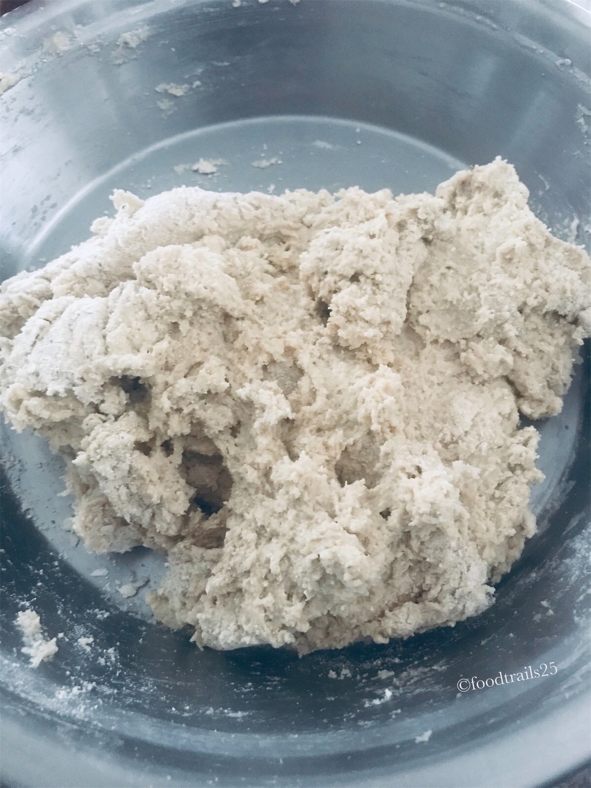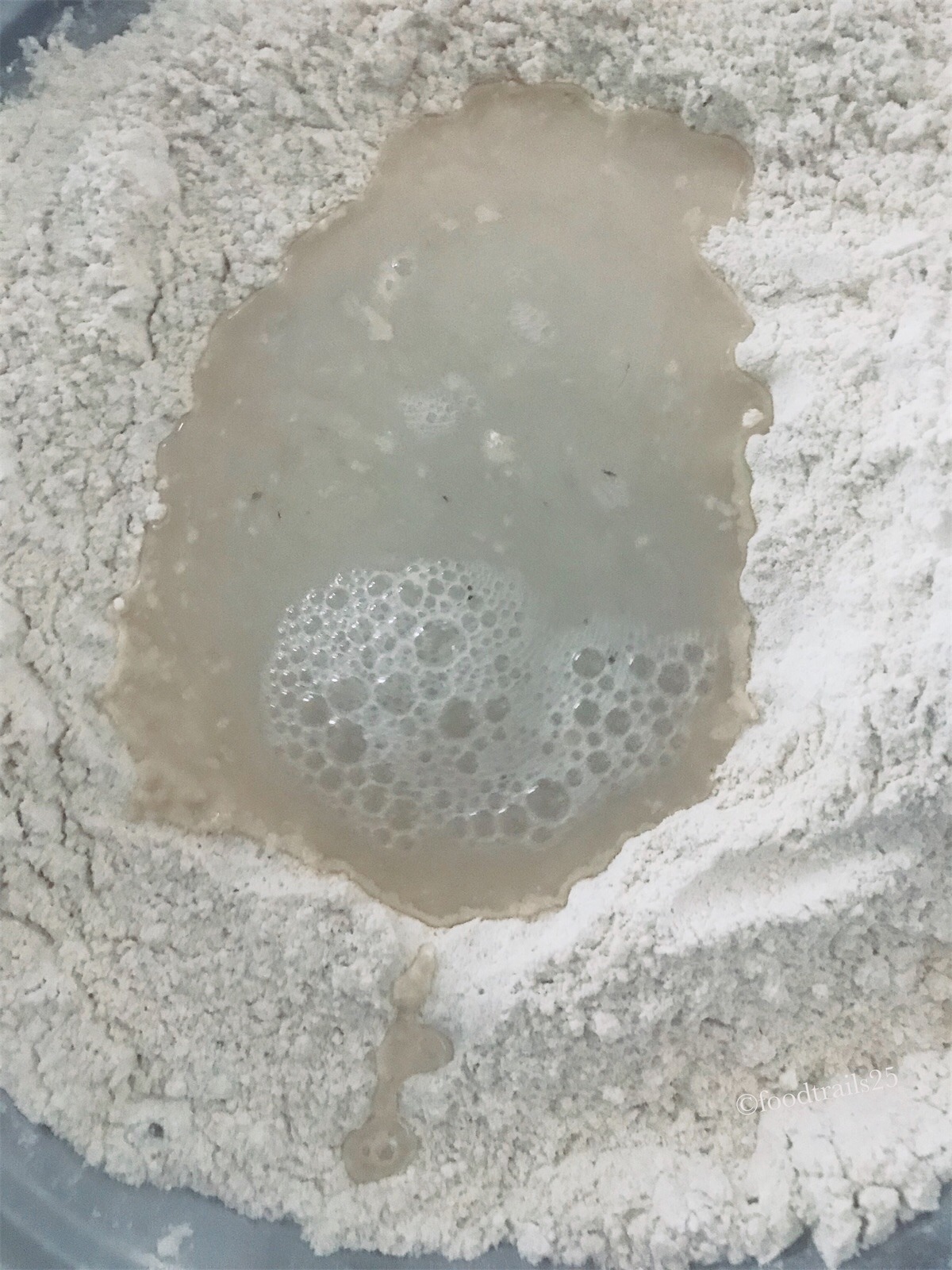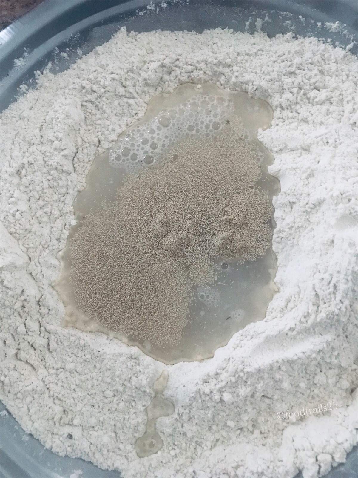 - Make a well in center, add lukewarm water(it should be just warm enough to touch), add yeast, and mix well. it just enough so that the dough comes together.