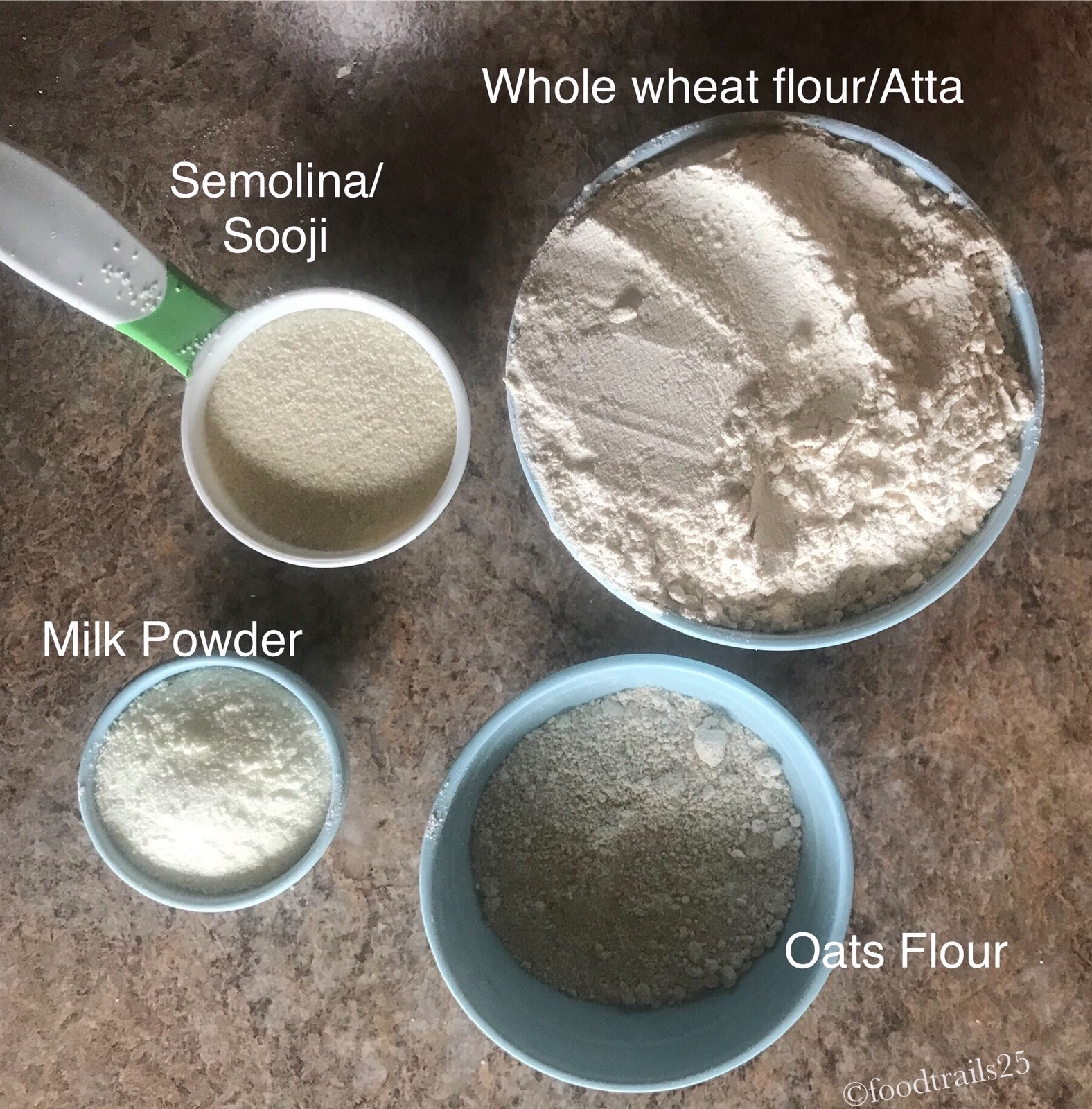 Whole wheat Flour(Atta), Semolina(Sooji) and Oats flour.