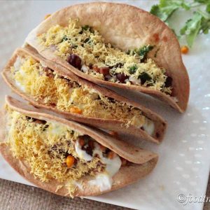 Papdi Chaat in Taco Style. Boiled potatoes and black chickpeas mix with boondi and sev topped with the sweet and spicy chutneys served in taco. Fusion recipe of Indian Papdi Chaat with Mexican Tacos.
