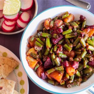 Beans Aloo Beetroot Subzi, a simple subzi(dry vegetable side dish) made with French String Beans and Potatoes in Indian spices. Add beetroots to your Aloo beans Subzi to enhance the nutrition value. Gluten-free Vegan and low oil recipe.
