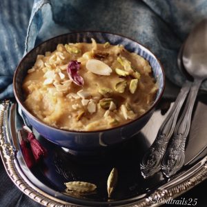 Add warm milk+water and start mixing. Continuously stir the mixture, till it is of creamy consistency.Do not cook til it gets too thick as the cooked hawa dries out after taking out off the flame.