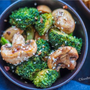 In a wok or in a non-stick pan, add oil and when the oil is hot enough, add garlic saute for a minute, add mushrooms and broccoli and stir-fry on high. Keep stirring the veggies so that it doesn't burn.