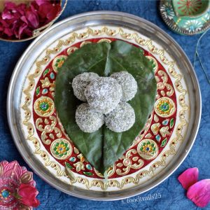 Take a small portion of it, flattened it in you palm, add gulkand and fennel mix, and give it ladoo shape sealing the edges and smoothing it with palms. You can also add candid fennel seeds.