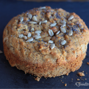 Transfer the batter to a pan/oven-proof dish. Top the cake batter with sunflower seeds, poppy seeds, and chia seeds.