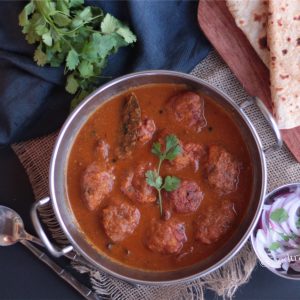 Lauki Ke Kofte, fried bottle gourd dumplings in spicy onion and tomato gravy. It is very popular in North India, especially in summers when fresh seasonal Lauki (Bottle Gourd) is available.