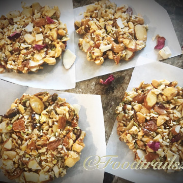 Chop nuts into small pieces or coarsely crush them.Add ghee to the pan and when it starts melting add chopped gur in it.