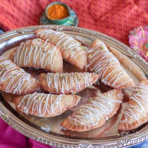Heat oil in kadhai or heavy bottom pan. Drop gujiyas one oby one in warm oil. Please take care that the oil should not be hot, else gujiyas will not cook from inside, and outer covering will bubble up.