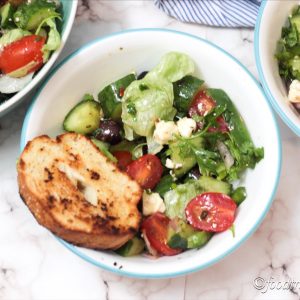 Refreshing Salad with fresh Cucumbers, Cherry Tomatoes, Red Onions, Green Bell Peppers, Olives and Feta Cheese in a sweet and tangy Olive oil dressing. Learn how to make Greek salad with olive oil vinaigrette dressing